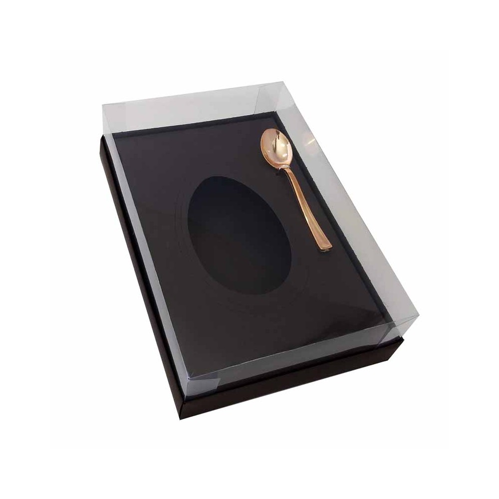 Caixa para ovos de páscoa de colher com berço interno destacável para acomodar três tamanhos diferentes de casca (250g, 350g e 500g) e furos para fixação da colher.